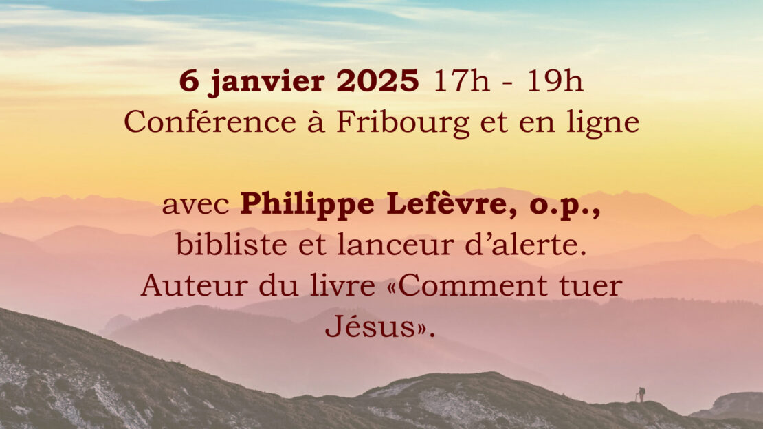 - 6.01.2025 : avec Philippe Lefèvre, o.p. bibliste, lanceur d’alerte sur les abus dans l’Eglise, auteur du livre Comment tuer Jésus. A Fribourg. Si vous souhaitez suivre la conférence en ligne, veuillez vous inscrire ici : https://bit.ly/3OGzrig